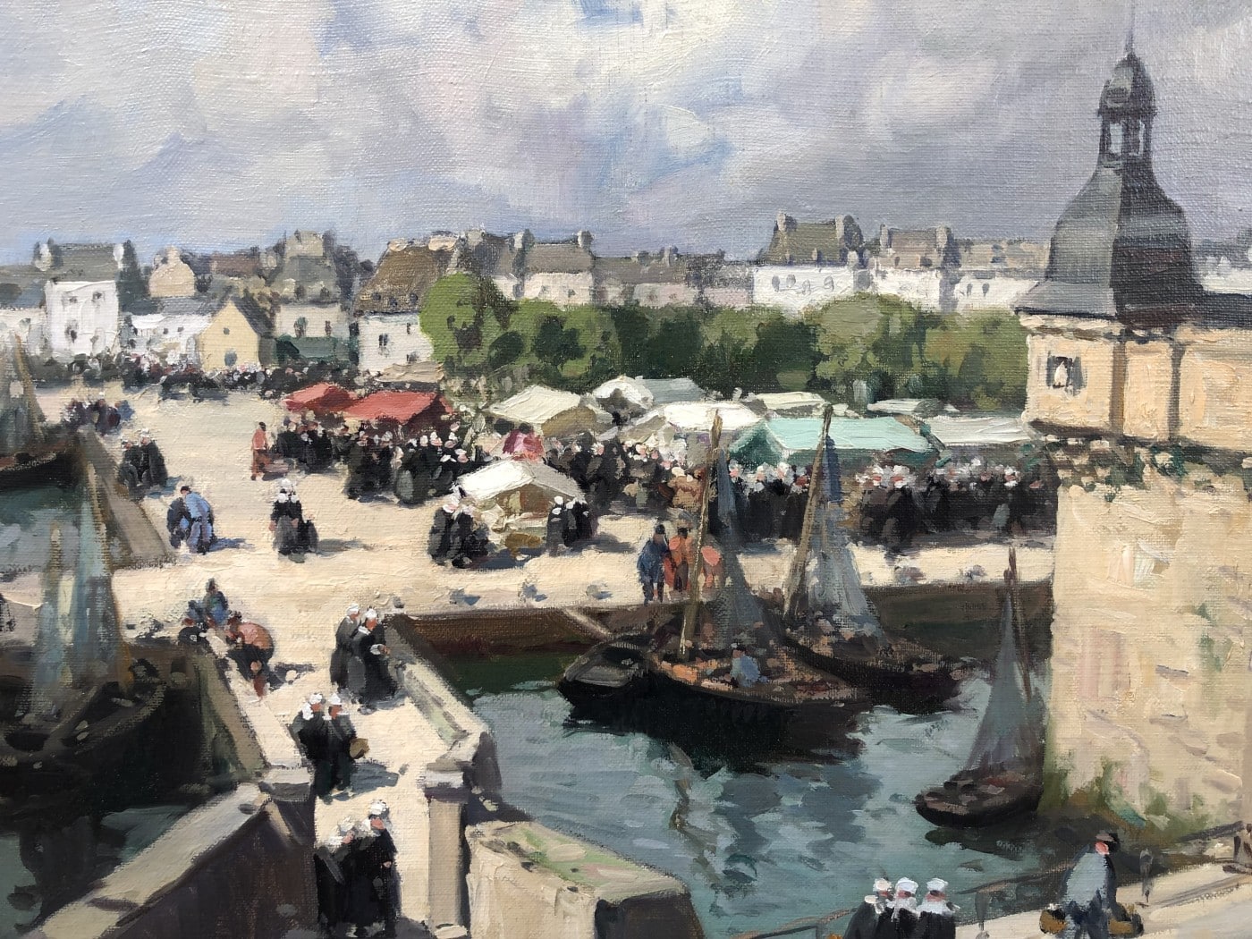 Huile sur toile signée en bas à gauche, situé « Concarneau (Bretagne) Le marché » au dos sur le châssis.